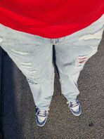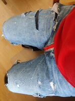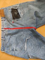 Hat schon zwei ordentlich Risse am Arsch und vorne ist sie im Schritt auch schon kaputt.