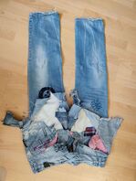 nun ist sie am Arsch nur noch ein großer Riss mit Fetzen drumherum, und vorne ist sie bis auf den Riss neben dem Zip und unter der Tasche durch das unterlegt noch recht heile