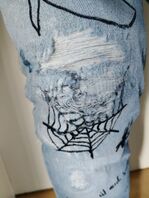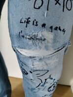 so langsam weiß ich warum das Teil so verdammt eng ist, die ist teils mehrfach übereinander Geflickt worden. Am Knie bei dem großen Riss sieht man ja den weißen Stoff, aber unter der neun aufgerissenen Stellekommt noch mal ein Stoff zum Vorschein...